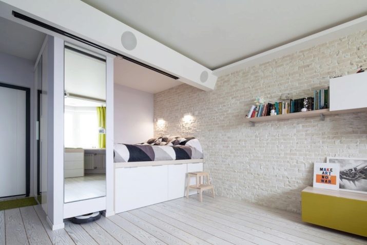 Ако в стаята ще живее млада семейна двойка без деца, тогава трябва да се обърне голямо внимание на зоната за спане. При планирането е важно да се обмисли дали има ниши в такъв едностаен апартамент. Ако са, тогава това може да бъде голямо предимство, важно е само правилно да оборудвате това място в апартамента. В ниша можете да поставите главата на леглото и да отделите тази зона с лека преграда. Това е важно да се има предвид при планирането.
