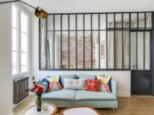 Що се отнася до преградите на модерните апартаменти, можете да изберете друга удобна опция. Преградата може да включва голям прозорец с тесни рамки. Можете да окачите светли завеси върху него. През деня целият апартамент ще бъде осветен, а вечер, когато завесите завесите, можете да получите пълно разделяне на апартамента на няколко функционални зони..