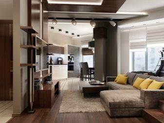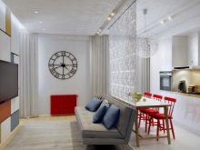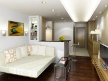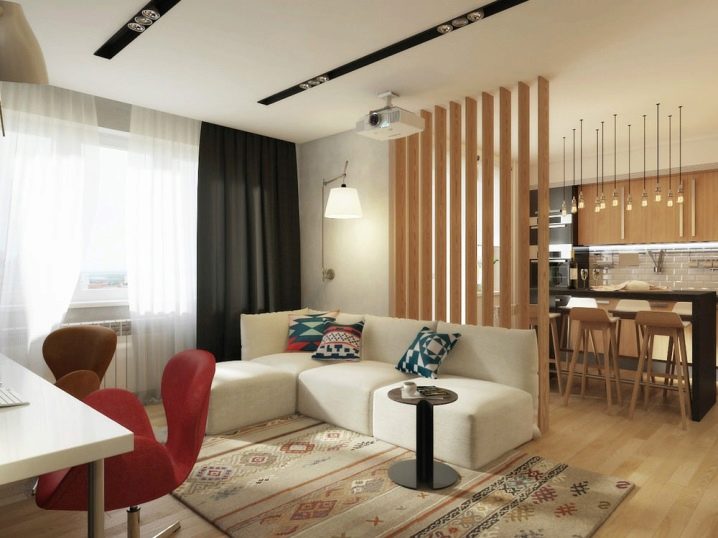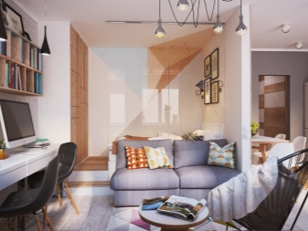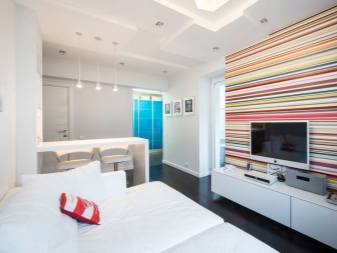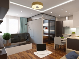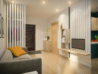 Пространството може да бъде визуално разделено на три части. Всекидневната и кухнята са отделени една от друга с бар плот, а спалнята е отделена от кухнята с обикновена стена. Идеален за много малки апартаменти.