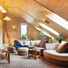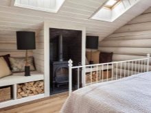 За творчески хора таванското помещение ще служи като студио или работилница. В такава къща можете да живеете по цял ден и да се отдадете на творчество или да дойдете само когато вдъхновението ви настигне. По -добре е първият етаж да бъде подреден възможно най -опростен и функционален. Стилът минимализъм е подходящ за декорация, защото ненужните детайли не трябва да разсейват творческата природа. Кухнята, трапезарията и спалнята-холът трябва да имат минимум мебели и максимум свободно пространство..