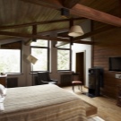 На втория етаж има комбинирана баня, две спални за настаняване на възможно най -много гости. Тук можете да поставите и детска стая с кът за игра. Ако на втория етаж има свободно място, тогава можете да оборудвате малък офис върху него, както съветват дизайнерите.