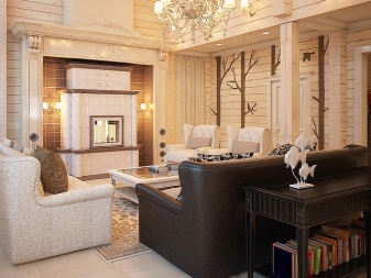 Следва голяма маса за хранене в центъра на стаята, над която се извисява скъп луксозен полилей. Недалеч от масата започва зона за отдих и прием: огромен диван, няколко кресла около масичката за кафе ще се превърнат в място за съвместни развлекателни дейности. В хола ще има страхотна камина, телевизор и рафтове за книги..