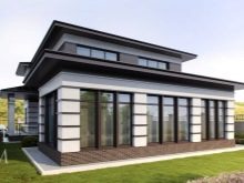 - Модерно: минимализъм, еко-стил, хай-тек. Тъй като всеки от тях включва панорамни прозорци, трябва да вземете предвид местоположението на околните къщи, за да запазите поверителността във вашата. Защо трябва да осигурите прозорци с по -малка площ или да “поставите” къщата дълбоко в територията, съответно голяма.