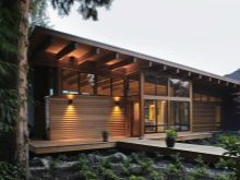 Посоката е напълно лишена от всякакви ексцесии: всички детайли, включително декоративни, се характеризират с приложена функционална цел. Така дървената ламперия помага да се запази топлината и удължава живота на къщата. Стил на швейцарска хижа, а терасата служи за увеличаване на използваемата площ.