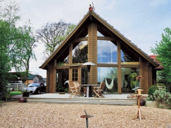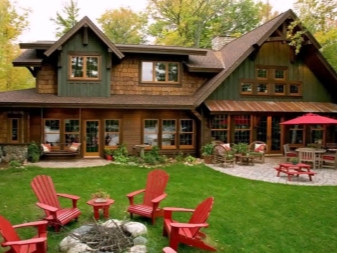 Посоката е напълно лишена от всякакви ексцесии: всички детайли, включително декоративни, се характеризират с приложена функционална цел. Така дървената ламперия помага да се запази топлината и удължава живота на къщата. Стил на швейцарска хижа, а терасата служи за увеличаване на използваемата площ.