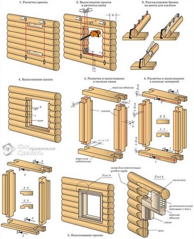 Първо, подгответе отвора. Той се свежда до промяна на геометричните му параметри, пролуките между страните му и основния блок трябва да са най -малко 130 мм. По -точно параметрите се определят, като се вземат предвид влажността на въздуха, характеристиките на дървесината и времето на работа на конструкцията – тези фактори влияят пряко върху вероятността от евентуално свиване.