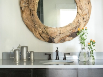 Има друг тип стая, за която изборът на огледало не е лесен процес. Това, разбира се, са огледала за баня. Такъв предмет не трябва да се страхува от влага, а рамката е по -добре изработена от дърво. Дървената рамка е най -екологичният и икономичен вариант, тъй като не се страхува от температурни промени, не отделя никакви миризми при нагряване и не се деформира.