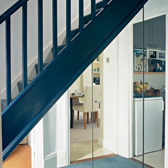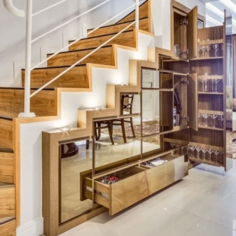Друг интересен вариант е да инсталирате напълно огледален шкаф под стълбите. Може дори да няма дръжки и може да бъде оборудван с врати на отделенията. Но всичките му фасади трябва да бъдат огледални. Това създава усещането, че стълбището буквално се носи във въздуха, тъй като вграденият гардероб няма да се забележи на пръв поглед. По този начин можете да увеличите пространството и функционално да го запълните под стълбите..