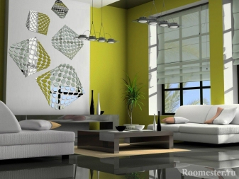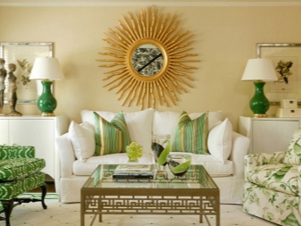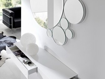 Огледалото в хола може да бъде плътно или буквално сглобено като пъзел. Тези опции са по -подходящи за декор на стени. Това могат да бъдат кръгли елементи с отразяващи части по краищата и модел в центъра. Вместо картини се монтират и огледала с широки рамки с различни форми. Те дори могат да бъдат представени като лъчисто слънце с огледална среда..