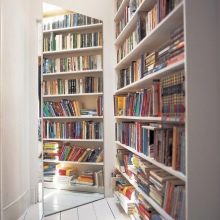 Огледална врата може да бъде направена и на входа на библиотеката. Корите от книги, отразени в него, ще създадат усещане за дълго пространство и интериорът ще изглежда още по -ярък. Огледалата могат да бъдат окачени заедно, по посока. Те дори могат да се редуват с картини..