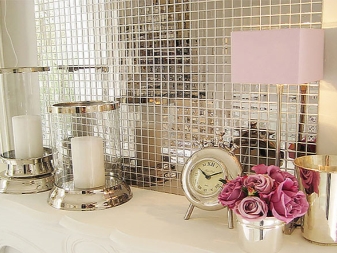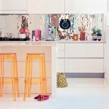 В кухнята можете красиво да украсите зоната на престилката с огледала. Така че с лъскави огледални мозайки, смесени със сребърни или златни пъзели, можете да изложите красиви шарки. Престилката ще изглежда ярка и стилна.