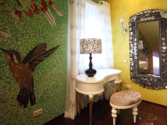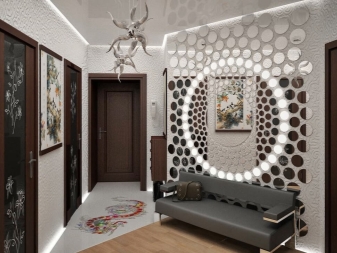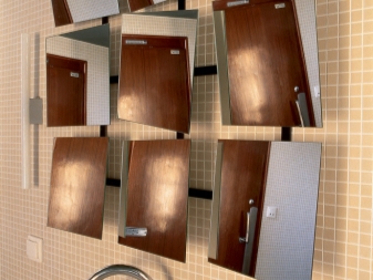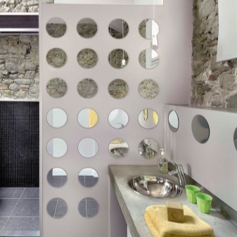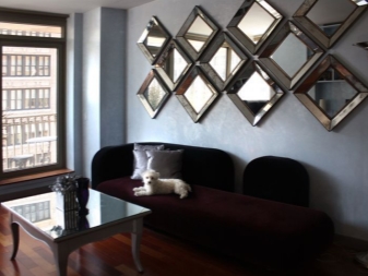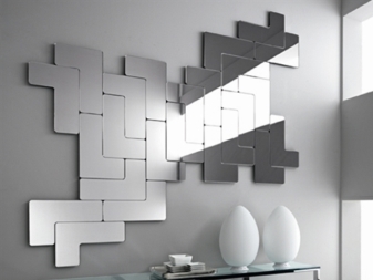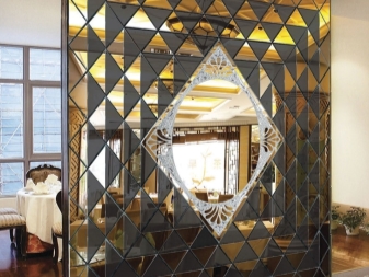 Огледалото може да има диамантена форма или друга необичайна конфигурация. Освен това не само едно голямо огледало се използва на стената, но също така е оформено с малки огледала. Например ромби или малки кръгли модели с форма на плоча.