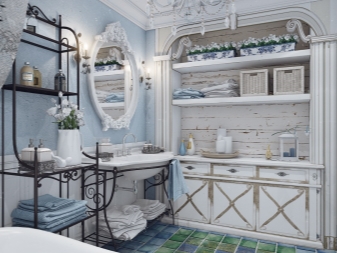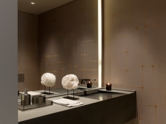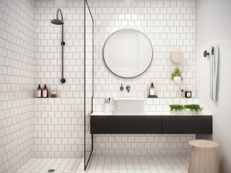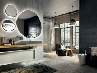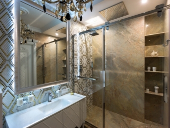 Изобилието от такива аксесоари в банята ще увеличи пространството, особено за помещения със светло покритие под формата на лъскави панели, мраморни и керамични плочки. По този начин огледалата могат дори да заменят части от стените и да запълнят пространството с блясък и блясък..