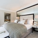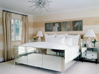 Следващият вариант за инсталиране на огледало в спалнята е подреждането на огледални фасади на нощните шкафчета. Тази традиция дойде при нас от чужди страни и сега набира популярност. Нощните шкафчета стават почти невидими и буквално изчезват в стаята. Освен това, с елегантния си блясък, те са в състояние да подчертаят симетрията, ако тези елементи са разположени от двете страни на широко легло..