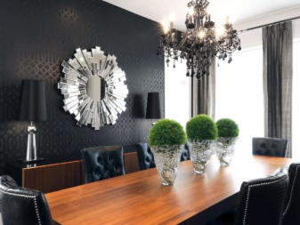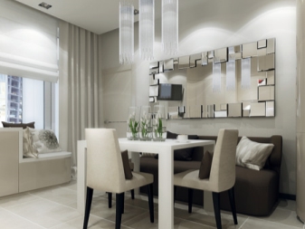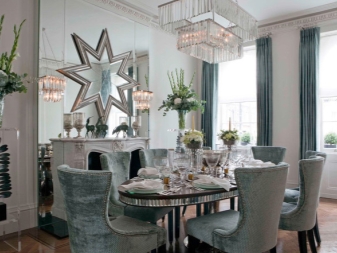 В кухнята огледалото се използва само като декоративен елемент. Трябва да го закачите тук, за да не виждате себе си, докато ядете. Но в тази стая може да се предвиди различно подреждане. Това могат да бъдат класически огледала, декориращи стени или панели от огледални парчета..