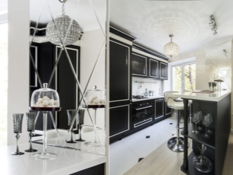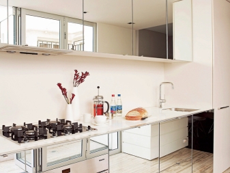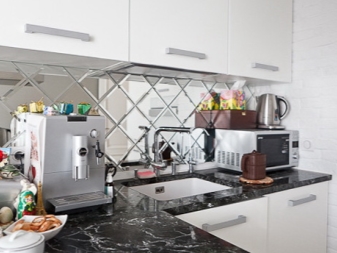 Във вътрешността на кухнята огледалните повърхности могат да присъстват и под формата на плот, бар брояч. Отразяващите повърхности изглеждат интересни и необичайни, добавяйки светлина към интериора на кухнята. Огледалата често се вмъкват в витрините, които са предназначени за съхранение на стъклени и съдове за хранене. Като алтернатива можете да го поставите в стаята, където съхранявате прибори за хранене и необходимите кухненски прибори..