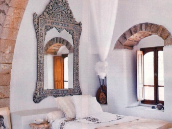Огледала в ориенталски стил имат рамки под формата на ръбове на плочи или ярки рамки в тюркоазени, сини, бели, червени нюанси и техните комбинации.