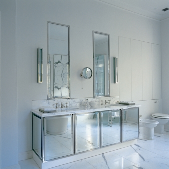 Всяка баня трябва да има огледало. На първо място, тя трябва да бъде поставена близо до мивката. Тук този функционален елемент е необходим за сутрешните процедури.. Ако в стаята има две мивки, същите огледала трябва да се поставят близо до двете, за да се подчертае симетрията..
