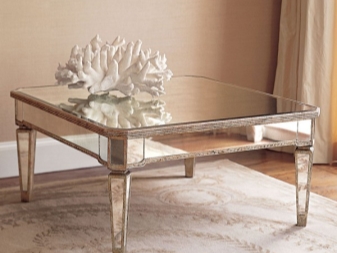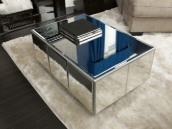 Огледалата се монтират не само близо до масичката за кафе, но и в нейната повърхност, както и вместо краката. Такива огледални интериорни елементи изглеждат много луксозни и отразяват всички предмети, които са на масата и наоколо. Създава усещане за безкрайно пространство..