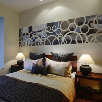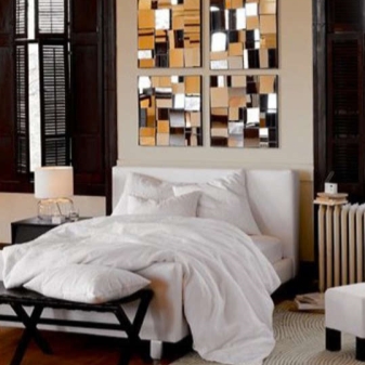 В допълнение, дизайнерите и планиращите често разпределят малко място за спалнята, а голямо огледало визуално ще разшири пространството. Панел огледала изглежда красиво в спалнята. Освен това това могат да бъдат големи и малки модели с различни форми, разположени по хаотичен начин или под формата на всяка фигура. Такъв уникален декорен елемент ще се превърне в акцент в интериора на спалнята..