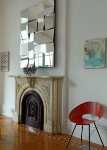 Ако имате камина у дома, тогава този аксесоар може да бъде окачен не само върху него, но и по този начин да облицова комина. В този случай интериорът се допълва с огледални первази и огледална рамка на вратата. Има и други интересни идеи: дървено стълбище с огледални мозаечни елементи е направено в интериора. Те могат да бъдат залепени под стъпалата.