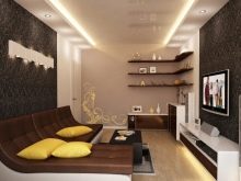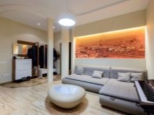 Струва си да се вземе предвид, че не е нужно да купувате огромни масивни полилеи за осветление. Прожекторите са най -добрият вариант.. Ниският таван е декориран, подобно на стените, в светли цветове.. За разлика от тъмните нюанси, светлите нюанси не “оказват натиск” върху жителите на апартамента. Понякога се използват огледала. Също така, добър вариант би бил използването на многостепенни стъпала на тавана, които също могат визуално да увеличат добре апартамента..