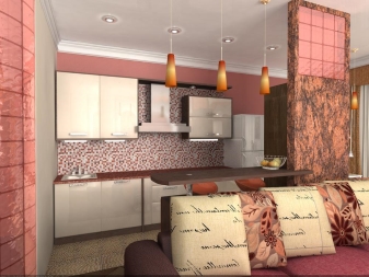 Безспорно решение за увеличаване на кухненската площ е да я свържете с залата. Огромно предимство е не само голямото пространство, което получавате, но и допълнителното разширение на тоалетната вана. Голямо семейство може да оборудва такава стая с маса за обяд и вече няма нужда да бъде претъпкано на обяд..