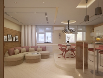 Напоследък дизайнерите препоръчват също комбиниране на кухни с хол. За това стената се разрушава и се монтира плъзгаща преграда или двойна врата. Подобна трансформация не само прави стаята уютна, но и разширява функционалността на стаята..