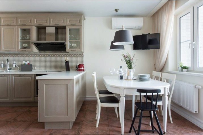 Много по -удобно е да поставите кухненска маса в такава стая, а широк перваз на прозореца може да служи като допълнително място за създаване на трапезария..