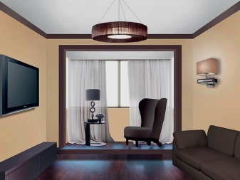 Използвайки различни дизайнерски трикове, можете да поставите столове, диван на мястото на лоджията и по този начин лесно да разширите хола, като го направите уютен и лек.