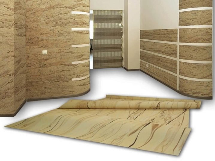 Уникален материал, имитиращ естествен камък. Това е подобие на тапет: каменни стърготини или пясък, боядисани в различни цветове, са прикрепени към нетъкан текстил. Този вид облицовка получи името си поради факта, че визуално прилича на камък, но запазва своята гъвкавост.. Такова покритие ви позволява да проектирате стена с издатини, вдлъбнатини, различни завои, капки и други дефекти..