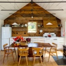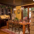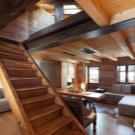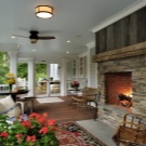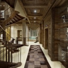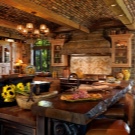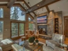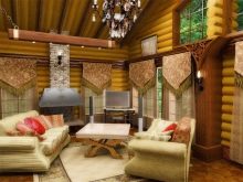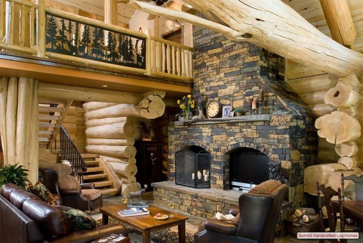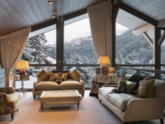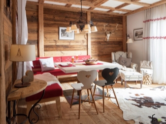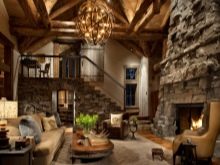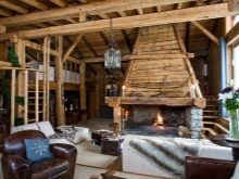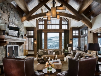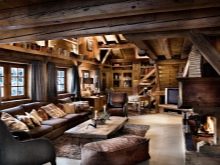 Хижа – минимална благородна декорация, дървени тавани и стени, без ултрамодерни домакински уреди. Дървените стени могат да бъдат украсени с плюшени глави на животни или висящи оръжия. “Античните” лампи във формата на свещи са подходящи като аксесоари, животински кожи могат да бъдат хвърлени върху дивана и фотьойлите, а тапицерията може да бъде изработена от кожа, кожа или вълна. Между другото, яркото осветление е неприемливо в този стил, тоновете трябва да бъдат заглушени. В хола е необходима камина – именно с нейното уютно осветление дизайнът в хола ще стане уникален и стилен.