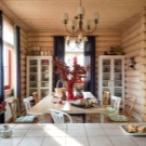 Дървена къща извън града може да изненада гостите не само със стени, изработени от трупи, но и с оригинална дървена купчина пред верандата, както и с отворена веранда в същия „дървен“ стил, където можете удобно да подредите удобно диван с хвърлено плетено одеяло – такава е прекрасната селска подредба.