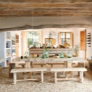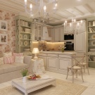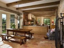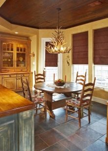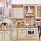 Кухня в този стил “изисква” масивна дървена маса, можете да поставите глинени чинии върху рафтовете, “остарял” бюфет, да окачите ленени кърпи с бродерия.