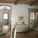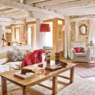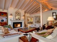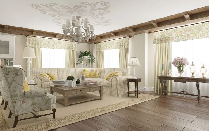 Стените с декоративна мазилка или декоративен камък също ще изглеждат добре. Подът в такава селска къща също трябва да бъде направен от дърво, но таванът може просто да бъде измазан в бяло или украсен с дървени греди. Камина идеално се вписва в хол в провинциален стил.