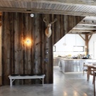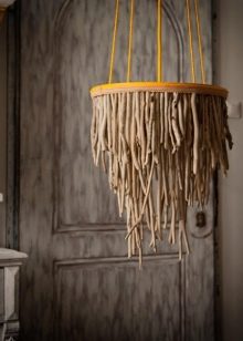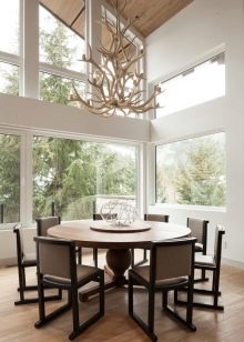 Вътре в такъв еко дом не забравяйте да се погрижите за ярко осветление. Това може да се постигне не само с помощта на лампи, но и с голям брой прозорци, които пропускат много слънчева светлина вътре в помещението. Пространството между прозорци или стъклени стени може да бъде боядисано в светли цветове – тогава ще постигнете усещане за прозрачност във въздуха и визуално ще увеличите площта. Полилей във формата на куп еленови рога ще допълни еко-дизайна на вашия хол или голяма кухня.