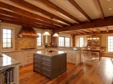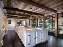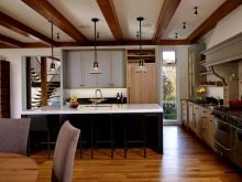 Опънатият ремък се превърна в общо решение на „горния“ проблем. Но, разбира се, тук не става въпрос изцяло за екологичност и автентичност.. Затова мнозина се спират на дъска, които могат да бъдат боядисани или лакирани. Таванните греди изглеждат великолепно в дървена къща и, между другото, не са взискателни към кадрите. Дори сравнително малка кухня придобива своя уникален вид, уют с греди. Те просто се правят пропорционални на даденото пространство. И по -често таванът се прави лек, а гредите са тъмни. Този контраст допълва стаята..