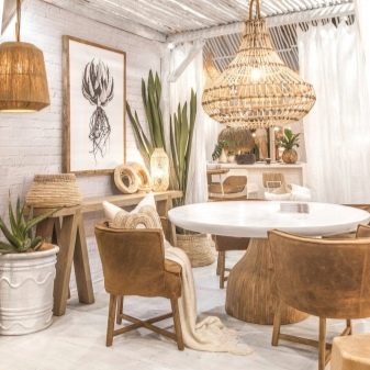 - Еко-бохо. Той се разклонява от основния стил и се различава с подценяването на цветовата температура. Пъстротата, която е в оригиналния бохо, не може да се намери тук. Но естествената спокойна гама, заедно с използването на много уютни естествени материали (от ратан до лен), завладява.