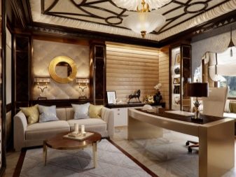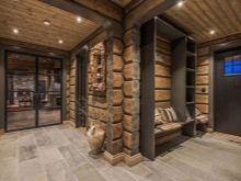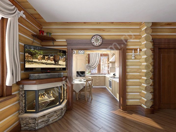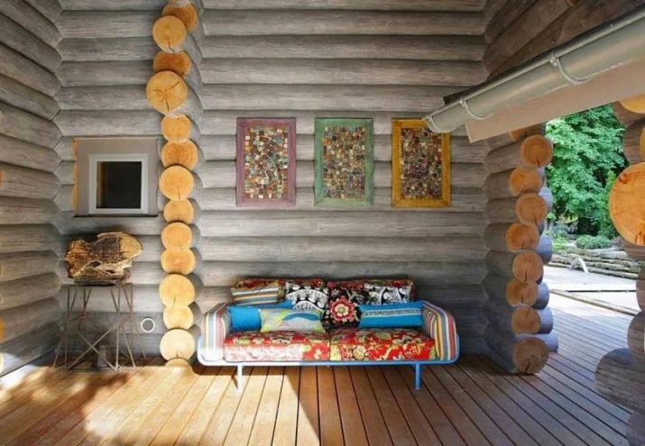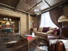 Добър вариант би бил да украсите вътрешността на къщата с естествени или стилизирани краища на трупите. Ако се различават по цвят от стените, ще се получи много добре.. В предложената версия това решение се допълва от: