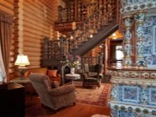 Със стил модерен можете да проектирате наистина шикозно „произведение на интериорното изкуство“. Ковани и резбовани части се използват успешно вътре. Но тяхната роля естествено е различна от тази, която би била в руски стил. Широко се използват витражи, умерено дебели греди.