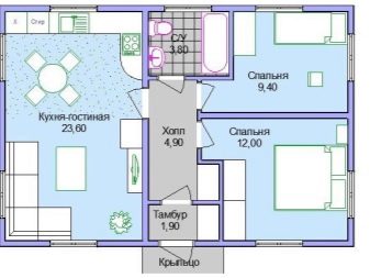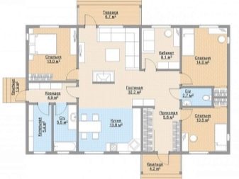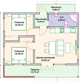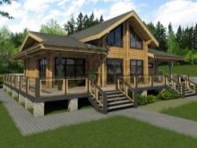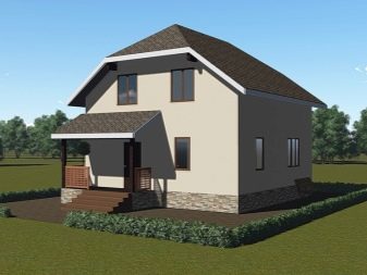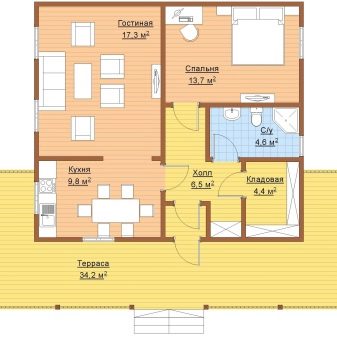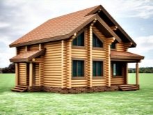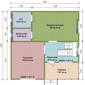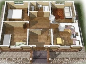 Хол в тези къщи е по -добре да го направите напълно изолиран от останалите зони. Заслужава да се отбележи, че такива къщи често се издигат заедно с тераси с различни размери. Понякога те се използват като кухни през топлите месеци.. Баня може да се комбинира.