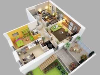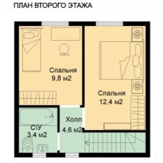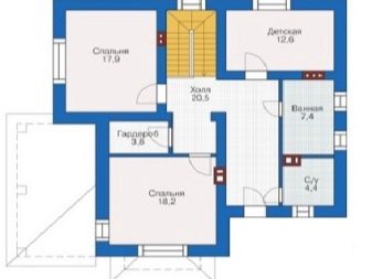 На приземния етаж често се намират различни помощни помещения, включително котелни, складови помещения и перални. Също така на едно ниво можете да организирате просторна всекидневна (25-30 кв. М), малка кухня, баня и открита тераса. На втория етаж си струва да направите две спални (ако е необходимо, оборудвайте детска стая с детска площадка) и малък коридор.
