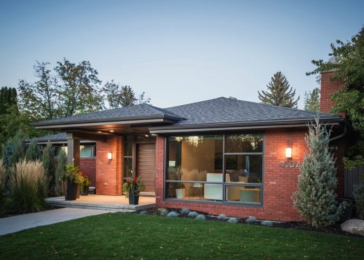 Едноетажни жилищни сгради от червена тухлена материя и с тъмен покрив и големи прозорци могат да бъдат друг добър вариант.. Такива дизайни ще изглеждат модерни и стилни..