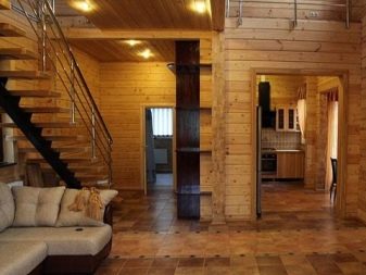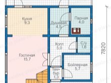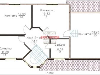 Една от опциите за такова жилище може да се похвали с 15,8 кв. м. Основната жилищна част на първия етаж е запазена за кухнята и хола, които се различават по площ около 1,5 пъти. В този блок има и втора светлина. Но съставът на “долните” помещения не свършва дотук. Важна роля в къщата играе блок за баня, с душ и парна баня. Към него има баня с площ от 1,8 кв. м. Можете да напуснете 5-метровата зала към верандата само през вестибюла.