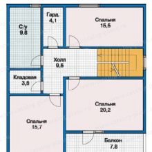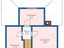 Интересно е и решението за планиране на втория етаж. Баня с площ 9,8 м2 е достатъчна, за да отговори на голямо разнообразие от практически и естетически нужди. В същото време тя е в непосредствена близост до превръзката. Основната част от помещенията са заети от 3 спални. Но дизайнерите намериха възможност да поставят тук складово помещение с площ от 3,8 кв. м.
