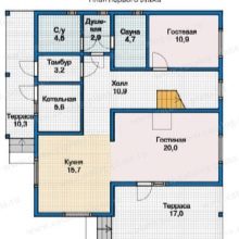 На първия етаж на къщата има 2 хола, разположени в различни ъгли. Важна характеристика на проекта е много голяма (достигаща 71,3 м2) тераса. Кухнята, трапезарията, холът и гардеробът са подредени в един ред. Имаше и място за залата. Като цяло този вариант на жилище поне си заслужава да бъде проучен..