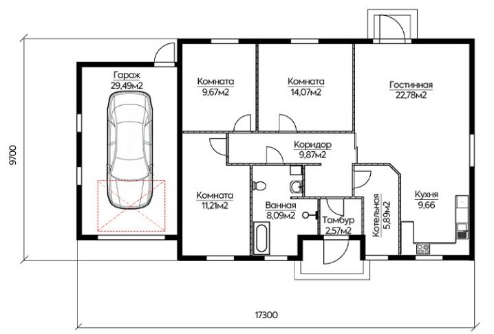 Има и приятни алтернативи.. Един от тях включва страничната граница на гаража, достигаща площ от 29,49 кв. м. Три хола заедно образуват буквата G. В коридора от тях можете да влезете в хола, котелното или вестибюла. Площта на банята е малко над 8 кв. м. Размер на кухнята 9,66 кв. m не е отделен от хола с прегради.
