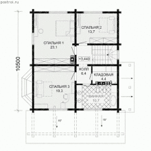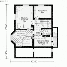 В къщи за постоянно пребиваване е подходящо да се вземат технически и помощни помещения в мазето. Така че в тази версия беше организирана сауна с душ кабина, с стая за отдих от 23 кв. м. Един от ъглите на мазето беше отведен под душ кабината. От другата страна беше разположено техническо помещение. Има и стълбищна зала. Горе са: