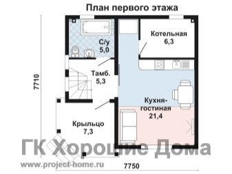 Размерът на банята на приземния етаж достига 5 кв. м. Осигурено е 6-метрово котелно помещение. Най -голямото пространство отдолу е кухнята и зоната за гости.. Горе има: