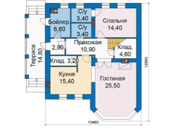 Но много хора се стремят да придобият дом с балкон и камина едновременно. За тях се разработват и подходящи проекти. В предложената версия площта на терасата е почти 14,8 кв. м. 15-метрова кухня и 25-метрова всекидневна създават всички условия за пълноценен живот. Също на приземния етаж има: